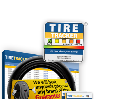 10,000 TIRE TRACKERS PLUS FREE USER GUIDE only $899.00/mo. 10,000 TIRE TRACKERS PLUS FREE USER GUIDE, TIRE TRACKER NOTIFIER™ 80 TIRE TRACKER NOTEPADS, & A FREE 2'x3' VINYL BANNER only $1,299.00/mo. |