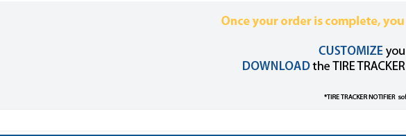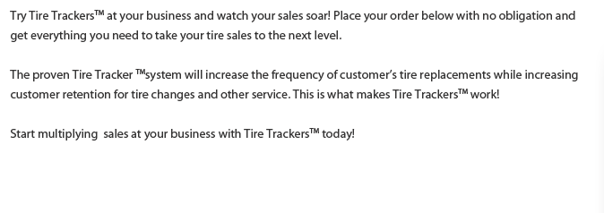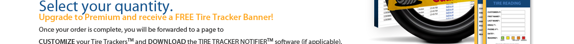 1,000 TIRE TRACKERS PLUS FREE USER GUIDE only $99.00/mo. 1,000 TIRE TRACKERS PLUS FREE USER GUIDE, TIRE TRACKER NOTIFIER™, 40 TIRE TRACKER NOTEPADS, & A FREE 2'x3' VINYL BANNER only $299.00/mo. |
